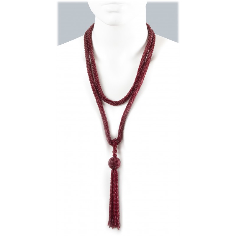 Diese lange Kette aus unzähligen kleinen Rocailleperlen wurde kunstvoll in aufwendiger Flechttechnik gearbeitet. Die ebenfalls handgefertigte Kugel mit den Fransen komplettiert dieses Modell perfekt. Sie kann lang oder doppelt gewickelt getragen werden.