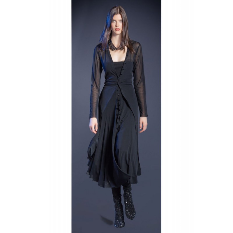 An den Schultern befinden sich bildschöne Spitzenapplikationen und zarte Strass-Steinchen. Die edle durchgehende Knopfleiste ist mit schimmernden Jetknöpfen, die raffinierterweise fast bis zur Schulternaht gesetzt wurden, versehen.