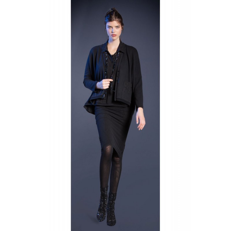 Lässig, eleganter Cardigan aus feinster Merinowolle. Wunderschön mit edler Spitze und Strass bestickt. Als Verschluss wurden bezaubernde Jetknöpfe gewählt.