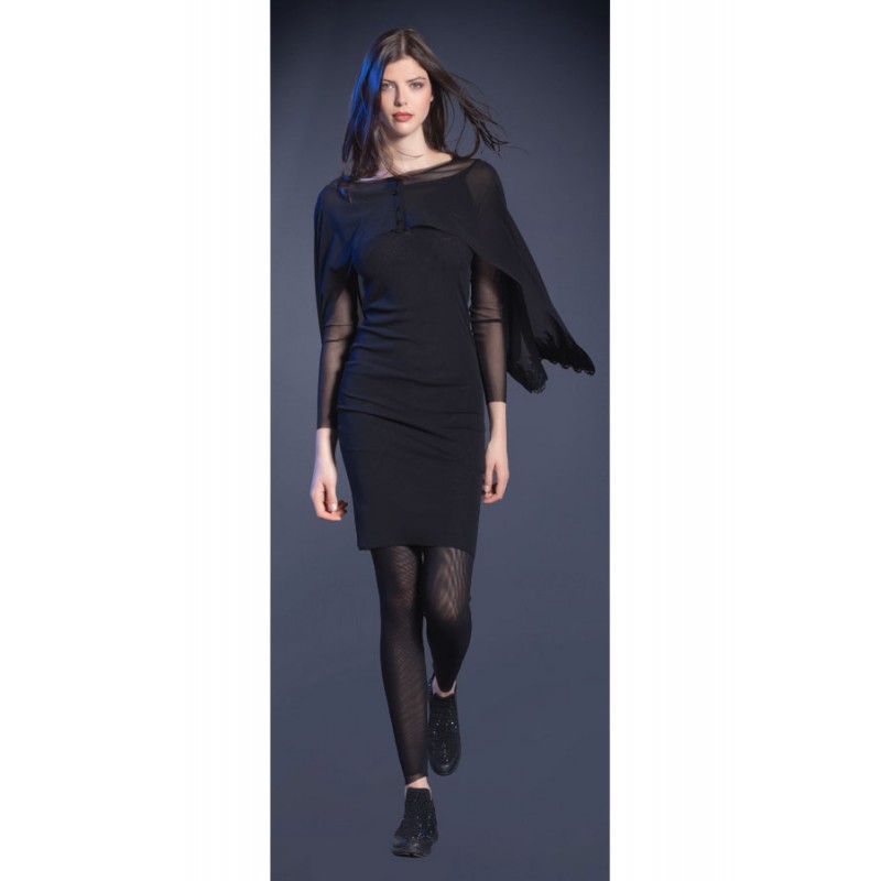 Zauberhafter Poncho mit Knopfleiste und feinen Spitzen- und Strass-Applikationen, welche in liebevoller Handarbeit angebracht wurden. Elegante, schimmernde Jetknöpfe schmücken die zarte Knopfleiste. Mit einer leichten Drehung verändern Sie den Poncho zum Minicape, um Ihre Arme auf elegante Art zu verdecken.