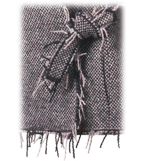 Reizvolle Jacke aus Boucle mit gefransten Kanten. Die Jacke hat einen sehr schmeichelhaften großen Schalkragen der auch als Kapuze getragen werden kann und als Verschluss ein Bindebändchen.
