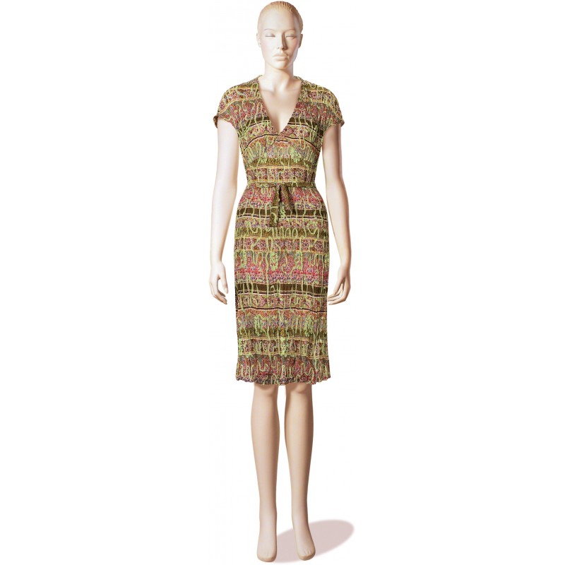 Duftiges Sommerkleid mit schöner Nahtführung bei der Brust. Es hat angeschnittene, kurze Ärmchen, einen hübschen V-Ausschnitt und einen schmalen Gürtel in der Taille.