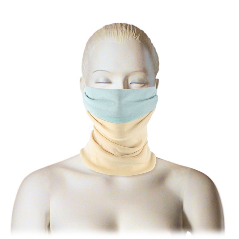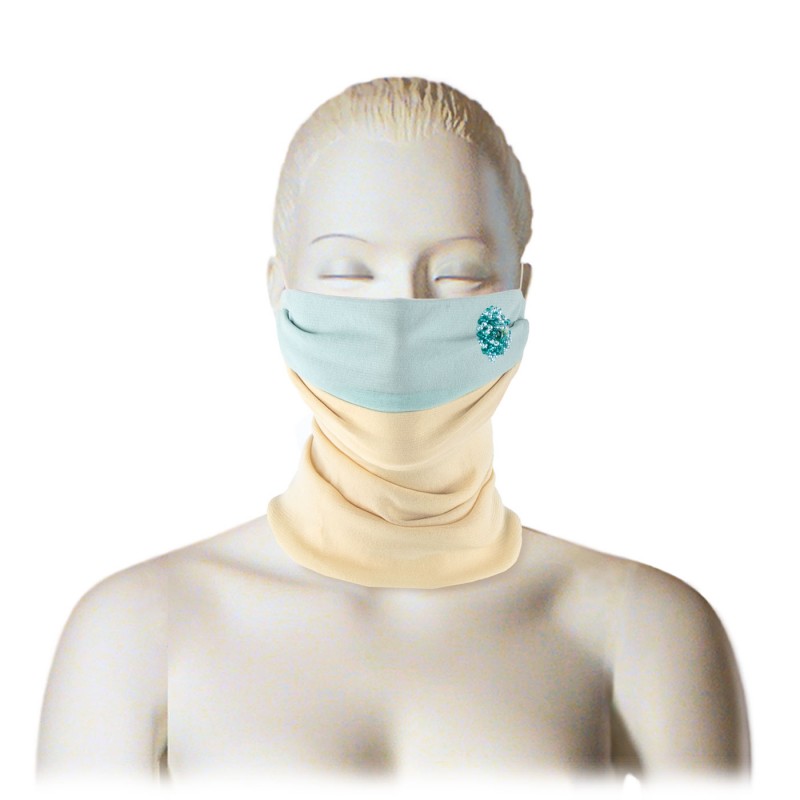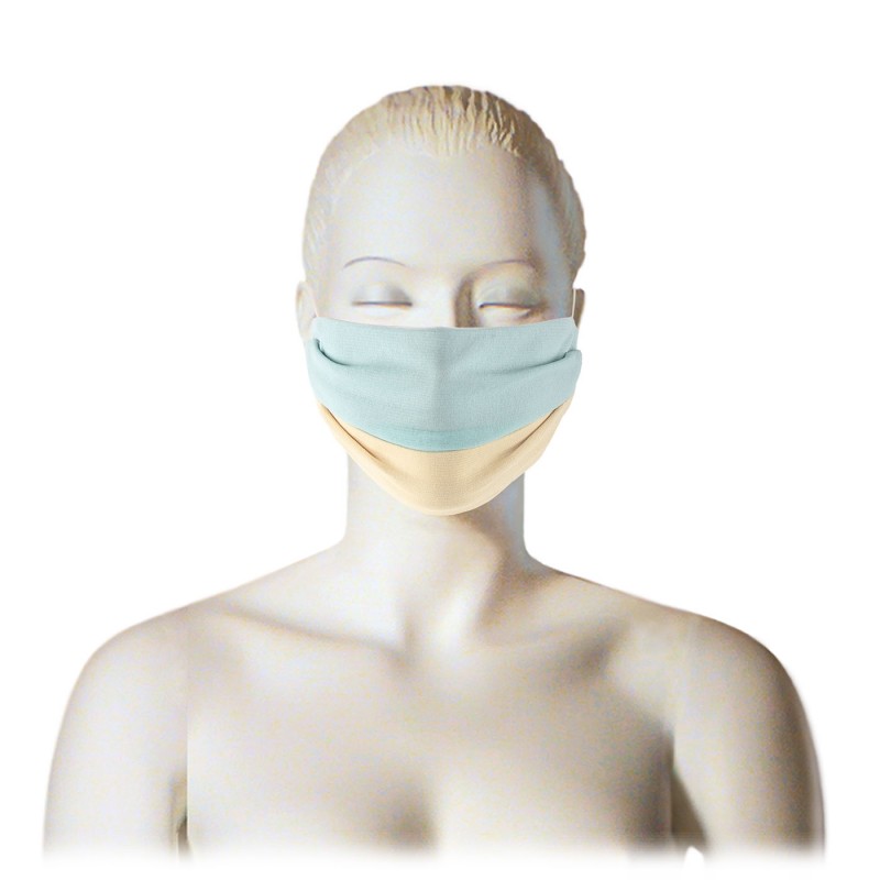 Raffinierte, sehr anschmiegsame, zweifarbige Maske aus leichtem Transparentstoff mit Innenfutter aus Jersey. Dieser Mund-Nasenschutz hat einen ausgeklügelten Schnitt ist mit einem Filterfach ausgestattet.
